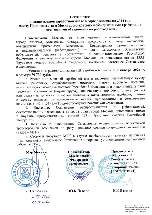 Соглашение о минимальной заработной плате в городе Москве на 2026 год между Правительством Москвы, московскими объединениями профсоюзов и московскими объединениями работодателей